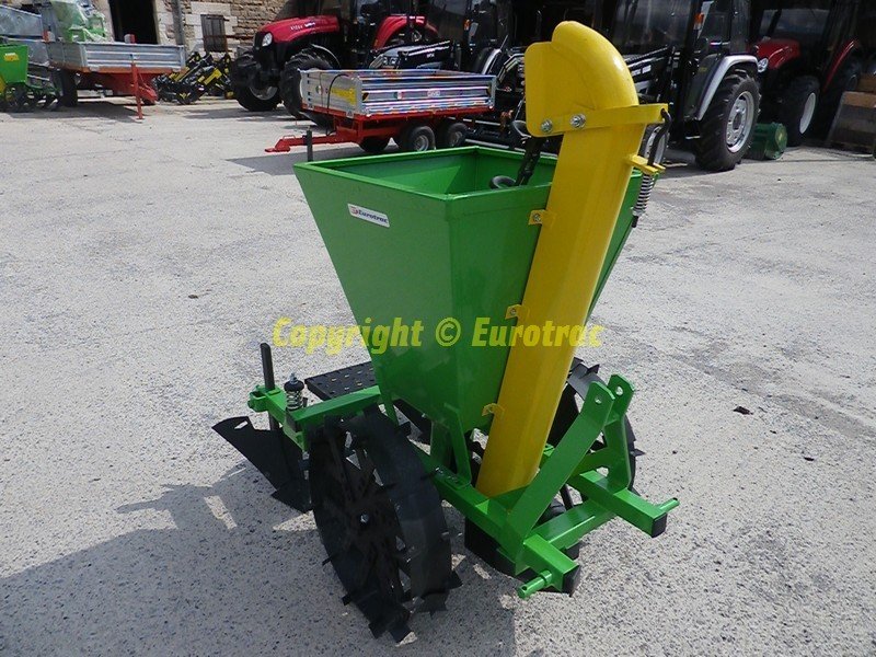 La planteuse de pommes de terre, pour tracteur et micro-tracteur à partir de 16 CV, est équipée d’un soc de plantation et de deux buttoirs avec sécurité à ressort, et dispose d’une plateforme pour un opérateur.