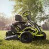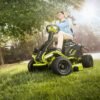 yobi signe le pari d’une autoportée avec batterie. Fini l’essence et les émissions sonores. Cette tondeuse autoportée à batterie Ryobi possède un moteur puissant comparable à un moteur thermique. Vous pourrez tondre jusqu’à 2h30 grâce à une seule charge. Ce rider offre une largeur de coupe XXL de 96 cm et possède 2 lames en acier. Facile à conduire et maniable, son rayon de braquage de 40 cm est parfait pour contourner les obstacles et couvrir un maximum de surface.